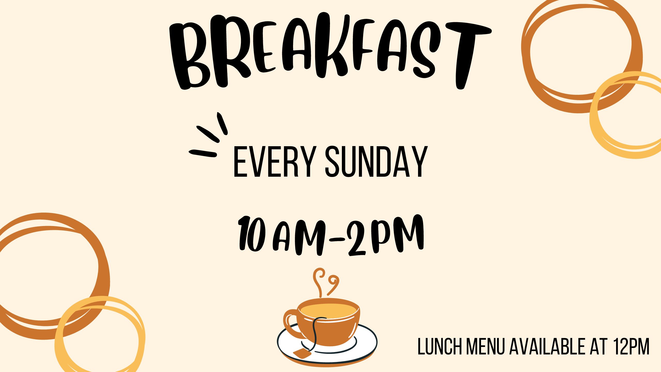 Join us for breakfast every Sunday from 10:00 am to 2:00pm. Our lunch menu will be available at 12:00pm.