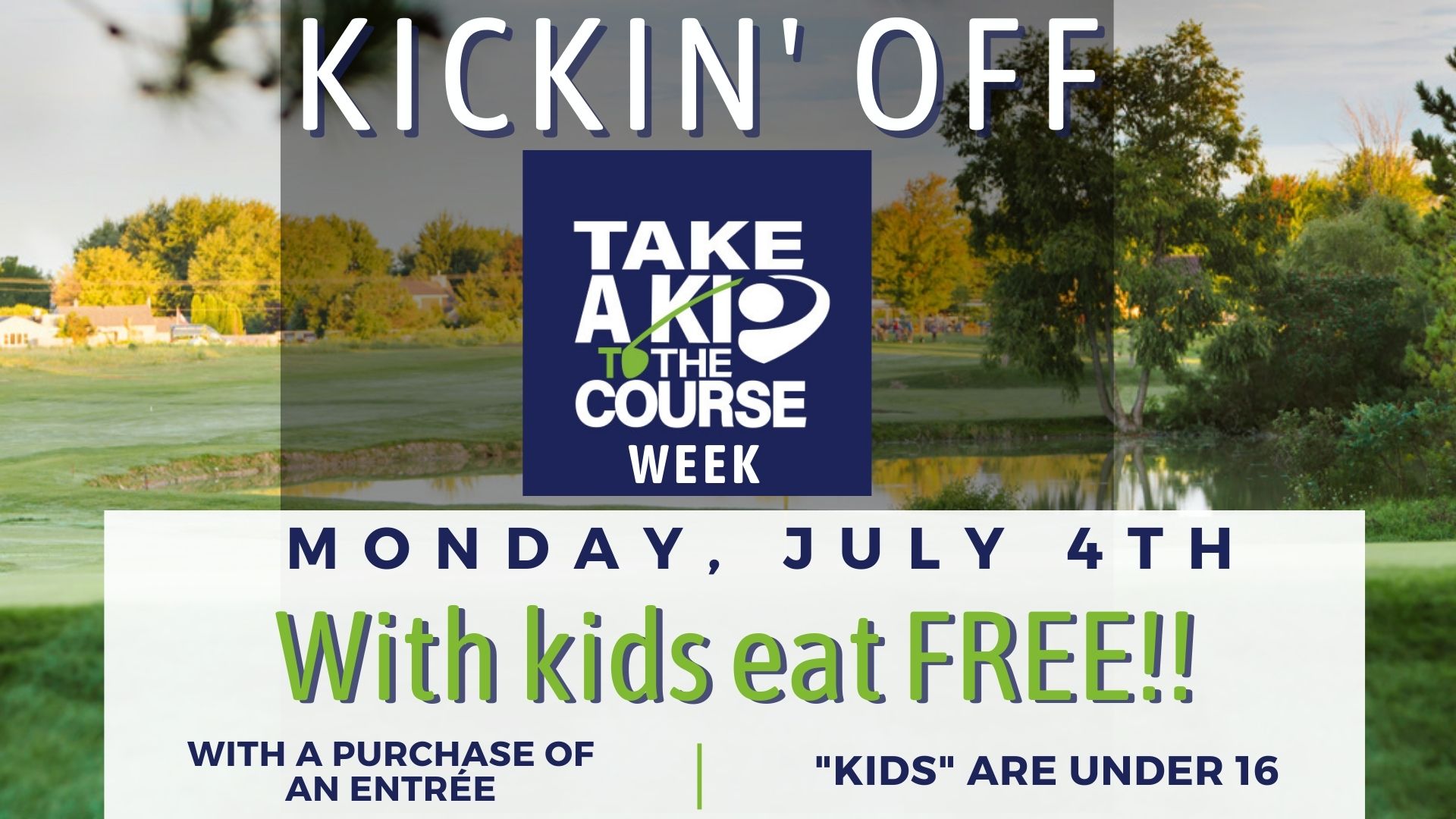 We’re kickin’ off take a kid to the course week on Monday July 4th with KIDS EAT FREE!!!