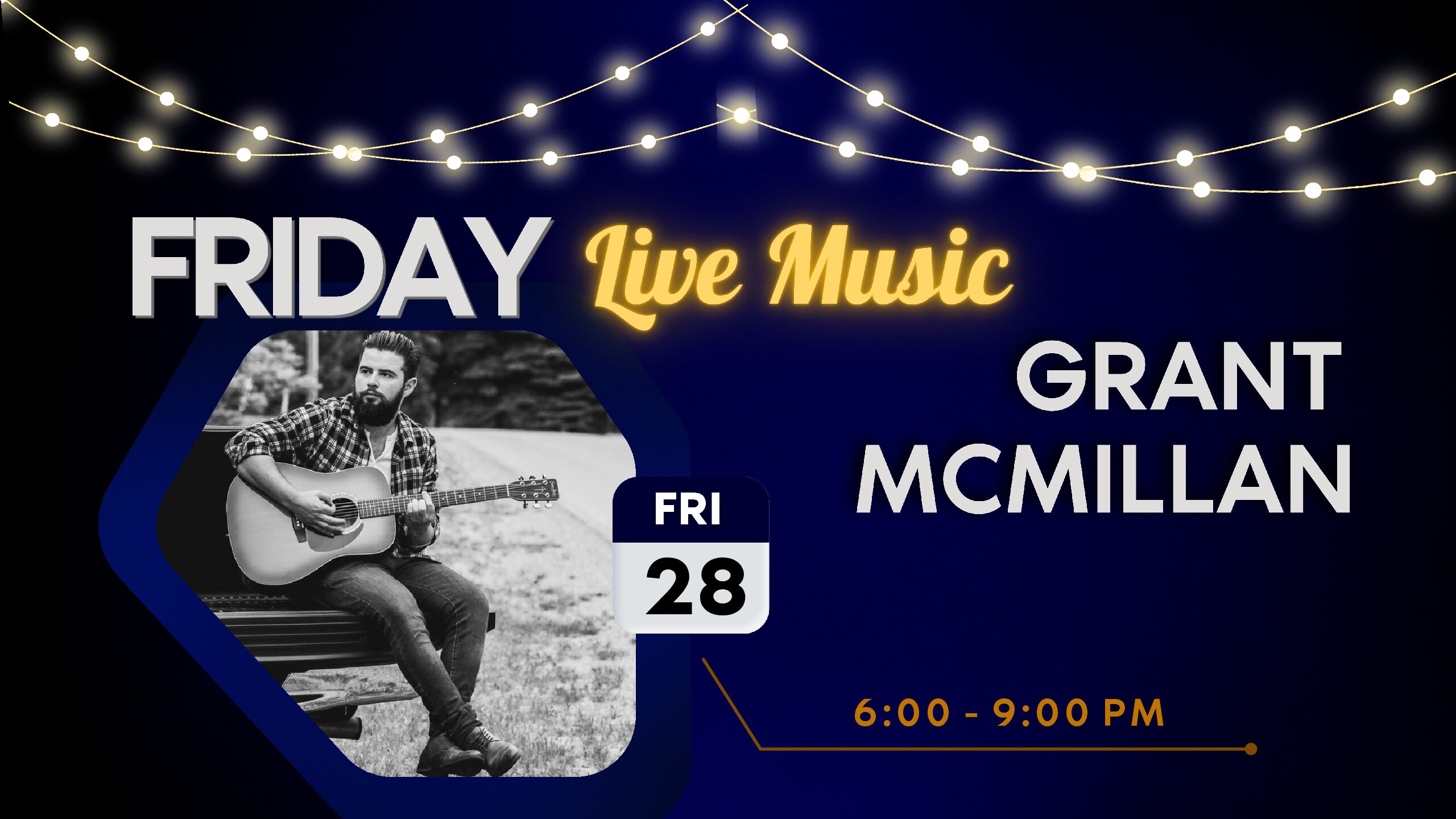 Join us for Live Music featuring Grant McMillan from 6 pm to 9 pm.