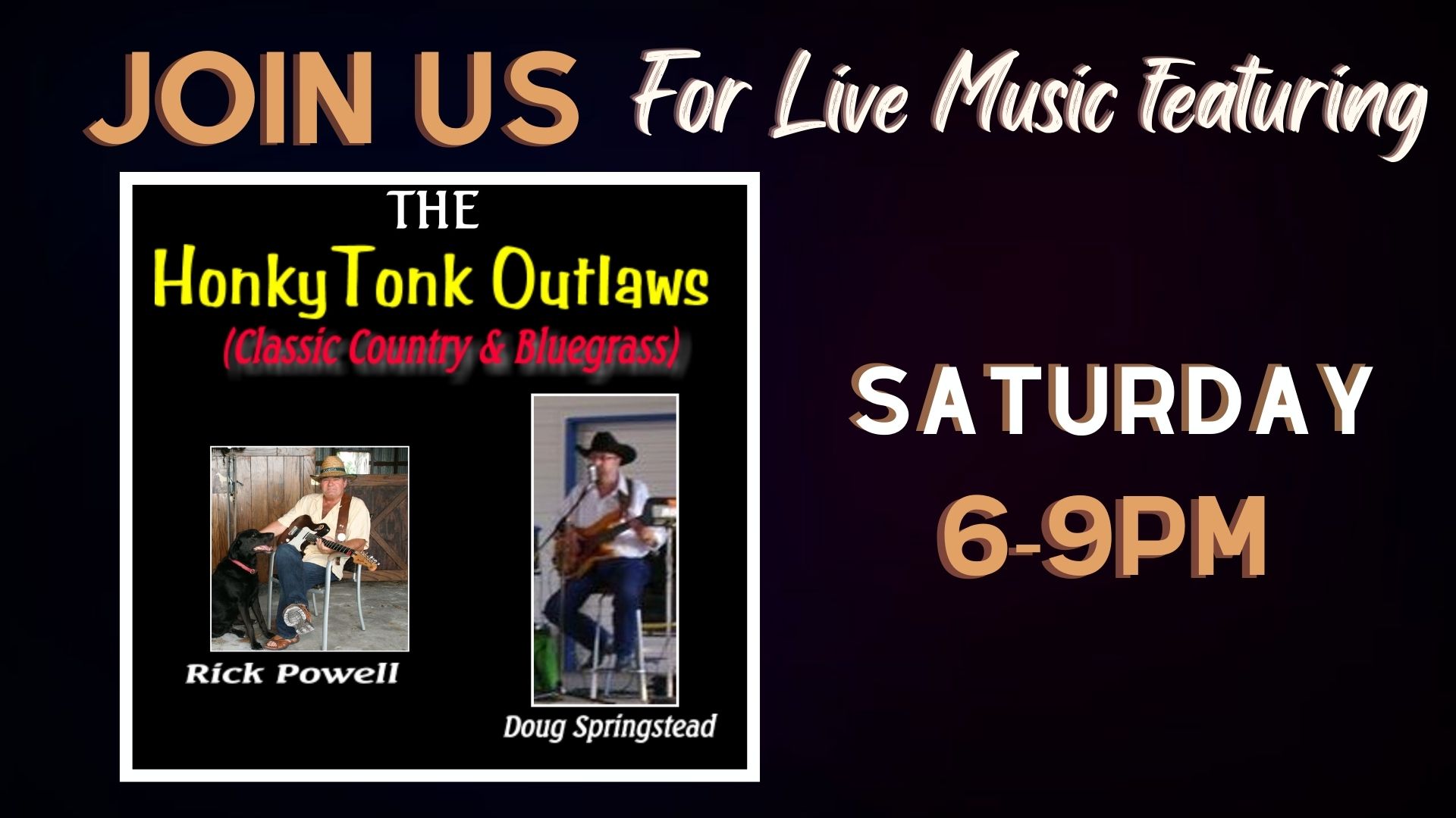 Join us for Live Music from 6:00pm-9:00pm featuring Honky Tonk Outlaw.