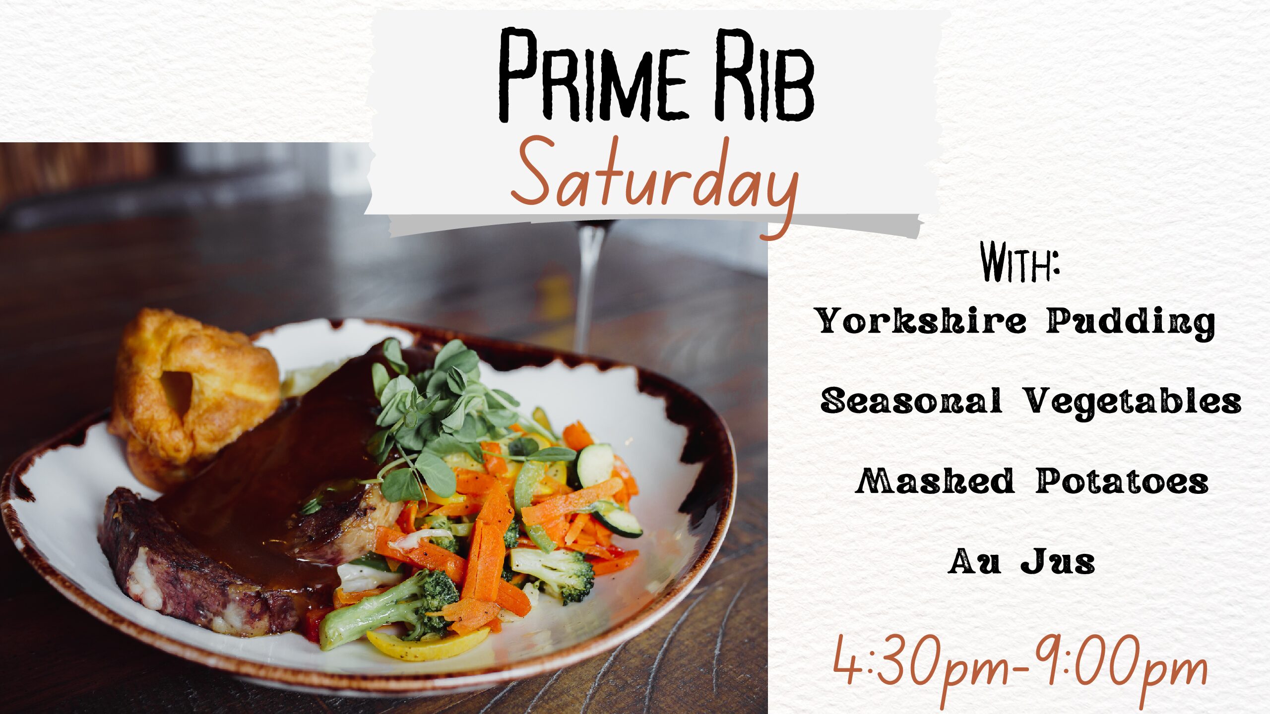 Join us on Saturdays from 4:30-9pm for our Prime Rib Dinner Special.